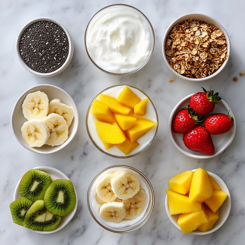 The main ingredients for this smoothie bowl create a tropical delight. I love using frozen pineapple chunks because they add a chill and creamy texture. Ripe bananas bring sweetness and creaminess to the mix. You can choose coconut milk for a rich flavor or almond milk for a lighter touch. Greek yogurt adds protein and thickness, while honey or agave syrup can enhance sweetness if you like.