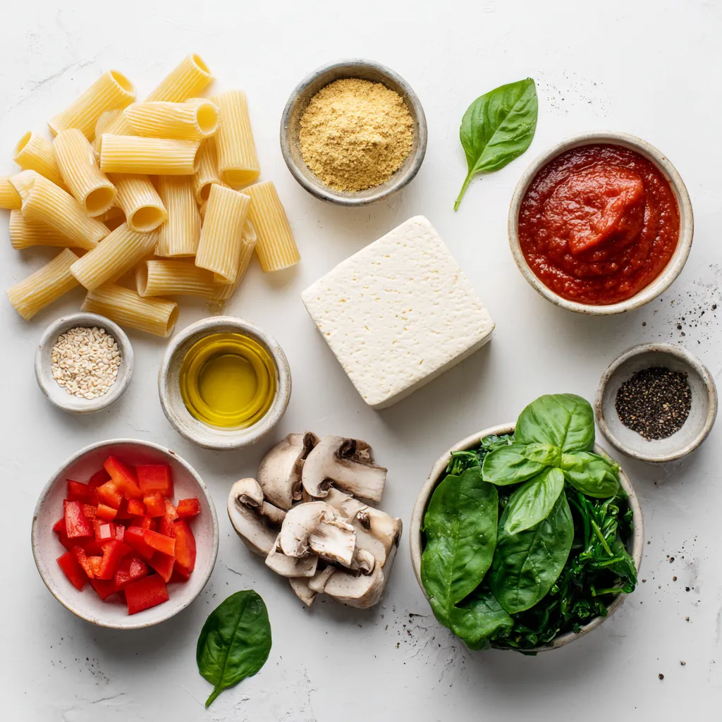 Tofu ricotta is the heart of this dish. It gives a creamy texture and cheesy flavor. The key components are: