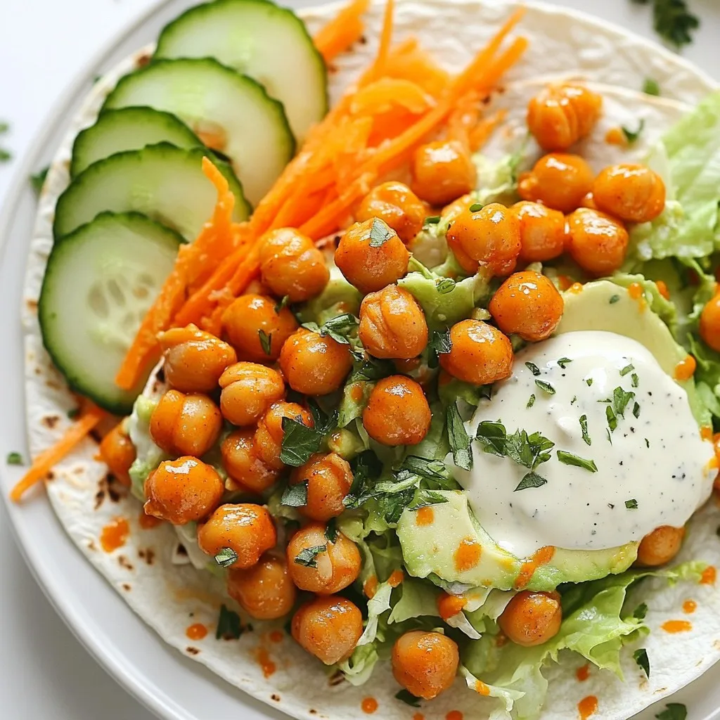 To make Vegan Buffalo Chickpea Wraps, you need a few key ingredients: - 1 can (15 oz) chickpeas, drained and rinsed - 4 large whole wheat tortillas or wraps These chickpeas are the stars of this dish. They bring a great texture and protein. Whole wheat tortillas add fiber and a nice flavor. The right seasonings can boost the flavor of your wraps. Here are the must-have items: - 1/4 cup hot sauce (like Frank's RedHot) - 1 tablespoon olive oil - 1 tablespoon apple cider vinegar - 1 teaspoon garlic powder - 1 teaspoon onion powder - Salt and pepper to taste Hot sauce gives the wraps their spicy kick. Olive oil adds richness. Apple cider vinegar adds tang. Garlic and onion powder enhance the taste. Fresh veggies add crunch and freshness to the wraps. Consider using: - 1 cup shredded lettuce - 1 medium carrot, julienned - 1/2 cup cucumber, thinly sliced - 1/2 avocado, sliced - 1/4 cup vegan ranch dressing (store-bought or homemade) Lettuce and cucumber offer a crisp bite. Carrots bring sweetness and color. Avocado adds creaminess. Vegan ranch dressing ties all the flavors together. {{ingredient_image_1}} Start by draining and rinsing your can of chickpeas. This step is key to remove excess sodium. Next, place the chickpeas in a medium bowl. Use a fork or potato masher to mash them slightly. You want them a bit chunky for texture. After mashing, add hot sauce, olive oil, apple cider vinegar, garlic powder, onion powder, salt, and pepper. Mix everything well until the chickpeas are coated in the spicy sauce. Now, preheat your oven to 400°F (200°C). Spread the chickpea mixture evenly on a baking sheet. This helps them roast evenly. Roast them in the oven for 20 minutes. Remember to stir them halfway through. This step makes them warm and slightly crispy, which adds great flavor. While your chickpeas roast, prepare your wraps. Lay out four large whole wheat tortillas on a clean surface. Start adding the fresh veggies: shredded lettuce, julienned carrot, cucumber slices, and avocado. Once the chickpeas are done, let them cool for a couple of minutes. Then, spoon the buffalo chickpeas onto each tortilla. Drizzle vegan ranch dressing on top for a creamy touch. Roll the tortillas tightly, tucking in the ends as you go. Optionally, cut the wraps in half for easier handling. Serve them right away. Enjoy your delicious, spicy Vegan Buffalo Chickpea Wraps! To get the best roasted chickpeas, follow these tips: - Drain and Rinse: Start with a can of chickpeas. Drain and rinse them well. This helps remove excess salt and improves taste. - Pat Dry: After rinsing, pat the chickpeas dry with a paper towel. This step helps them get crispy. - Use Enough Oil: Mix in olive oil with your chickpeas. This helps them crisp up nicely while roasting. - Don’t Overcrowd: Spread the chickpeas on the baking sheet in one layer. This allows hot air to circulate and makes them crispy. - Stir Halfway: Stir the chickpeas halfway through roasting. This ensures even cooking and crispiness. Making the perfect wrap is easy. Here are my best tips: - Lay It Flat: Start with a tortilla laid flat on a clean surface. This gives you room to add your fillings. - Layer Wisely: Place your greens first, like lettuce, to create a barrier. This keeps the tortilla from getting soggy. - Add Chickpeas Last: Spoon the roasted chickpeas on top of the veggies. This keeps the wrap balanced and tasty. - Don’t Overfill: Don’t add too much to the wrap. A little goes a long way. Aim for about a half-cup of filling. - Roll Tightly: When rolling, tuck in the sides as you go. This keeps everything inside and prevents spills. Serve your Vegan Buffalo Chickpea Wraps in fun ways: - Dipping Sauce: Serve with extra vegan ranch dressing on the side for dipping. This adds a creamy touch. - Fresh Herbs: Sprinkle fresh herbs, like parsley or cilantro, on top for a burst of color and flavor. - Side Dishes: Pair with a simple salad or sweet potato fries. Both add different textures and flavors. - Meal Prep: These wraps are great for meal prep. Make them ahead of time and store them in the fridge. - Customize: Feel free to swap out veggies based on what you have. Enjoy experimenting with different flavors! Pro Tips Adjust the Heat: If you prefer a milder flavor, reduce the amount of hot sauce or mix in a bit of vegan mayo to balance the heat. Perfectly Crispy Chickpeas: For extra crunch, spread the chickpeas out in a single layer on the baking sheet and ensure they’re not overcrowded. Wrap It Right: When rolling the wrap, make sure to tuck in the sides as you go to prevent any filling from spilling out. Meal Prep Friendly: The chickpea filling can be made in advance and stored in the fridge for up to 4 days, making it perfect for quick lunches or dinners. {{image_2}} If you want to mix it up, try other proteins. You can use lentils instead of chickpeas. They add a nice texture and flavor. Another option is to use black beans. They are tasty and packed with protein. You could even use tofu for a different twist. Just marinate the tofu in the hot sauce before cooking it. The type of wrap you use can change the flavor. Whole wheat tortillas are great, but you can try spinach wraps too. They add color and nutrients. If you like a gluten-free option, use corn tortillas. They work well and are easy to find. You can also use lettuce leaves for a low-carb choice. They are crunchy and fresh. Vegan ranch dressing is a crowd favorite, but there are other options. You can use hummus for a creamy base. It adds protein and flavor. Another choice is a spicy avocado spread. Just mash avocado with lime juice and hot sauce. You can also top your wraps with salsa for some extra zest. Fresh herbs like cilantro or parsley also make a nice touch. To store leftover wraps, place them in an airtight container. I recommend wrapping each one in foil or plastic wrap first. This keeps them fresh. Store them in the fridge for up to three days. If you want to keep them longer, freezing is a