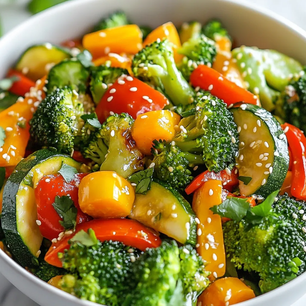 Heat your skillet or wok over medium-high heat. Add the vegetable oil and let it shimmer. Then, add the minced garlic and grated ginger. Cook them for about 30 seconds until you smell the aroma. Now, toss in the broccoli, bell peppers, and carrots. Stir them often for about 3 to 4 minutes. You want them to soften but still be bright. After that, add the zucchini and snap peas. Cook for another 2 to 3 minutes. All vegetables should look vibrant and tender-crisp.