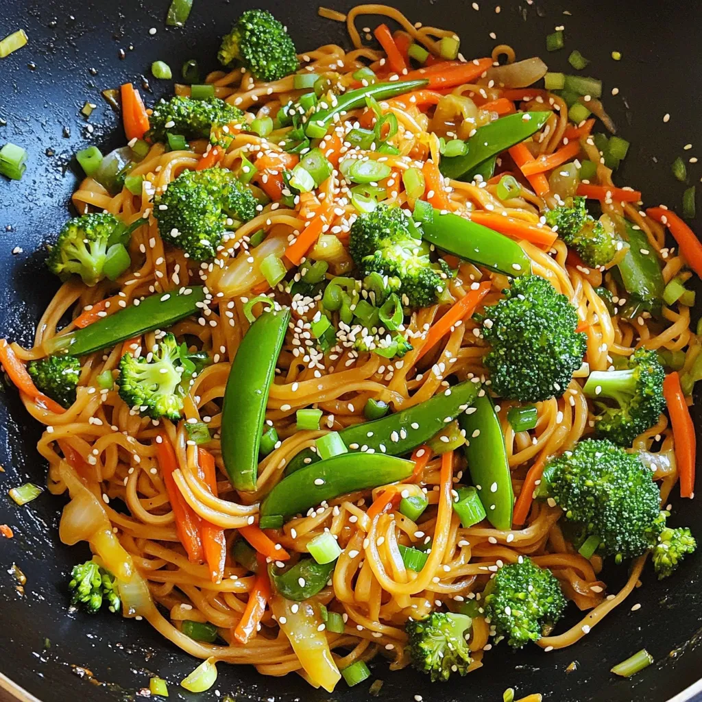 - 8 ounces lo mein noodles - 1 cup broccoli florets - 1 bell pepper, thinly sliced (any color) - 1 cup snap peas, trimmed - 1 large carrot, julienned - 3 green onions, chopped - 2 cloves garlic, minced - 1-inch piece of ginger, grated The main star of this dish is the lo mein noodles. They are chewy and soak up flavors well. Fresh vegetables give the dish color and crunch. Broccoli adds nutrients, while bell peppers bring sweetness. Snap peas add a nice snap, and carrots offer a bright taste. Garlic and ginger provide aroma and zest. - 3 tablespoons soy sauce - 1 tablespoon hoisin sauce - 1 teaspoon chili paste (optional, for heat) - 2 tablespoons sesame oil Soy sauce is essential for that savory flavor. Hoisin sauce adds a sweet note that contrasts nicely. If you enjoy heat, add chili paste for a spicy kick. Sesame oil gives a rich, nutty taste that brings it all together. - Sesame seeds for garnish - Salt and pepper to taste A sprinkle of sesame seeds on top adds a nice crunch and visual appeal. Always taste and adjust with salt and pepper to make the flavors pop. These simple garnishes elevate the dish, making it not just tasty but also beautiful. To cook lo mein noodles perfectly, start by bringing a large pot of water to a boil. Add the noodles and cook them as the package says. Usually, this takes about 4-5 minutes. Stir them gently to prevent sticking. Once they are soft, drain them well and rinse under cold water. This stops the cooking and keeps them from getting mushy. Set the noodles aside while you prepare the veggies. To stir-fry the veggies, heat two tablespoons of sesame oil in a large wok or frying pan over medium-high heat. Add minced garlic and grated ginger. Stir them for about 30 seconds. This brings out their great smell. Now, toss in the broccoli, bell pepper, snap peas, and julienned carrot. Stir-fry these for 4-5 minutes. You want them to be tender but still a bit crisp. This makes the dish colorful and fresh. Once the veggies are ready, add the cooked lo mein noodles to the pan. Pour in three tablespoons of soy sauce, one tablespoon of hoisin sauce, and chili paste if you like heat. Using tongs or chopsticks, toss everything together. Mix well until all the noodles and veggies are coated in the sauce. Season with salt and pepper to your taste. Finally, stir in the chopped green onions for extra flavor. Serve hot with sesame seeds on top for a nice touch! To get the best stir-fry, heat is key. I use medium-high heat for the oil. This helps the garlic and ginger release their flavors. Add the veggies in the right order. Start with the broccoli and carrots first. They take longer to cook. After a few minutes, toss in the snap peas and bell pepper. They should stay crisp. Stir-fry for about four to five minutes. This timing gives you tender yet crunchy vegetables. Boost the taste with simple spices and sauces. Soy sauce adds a salty kick. Hoisin sauce gives sweetness and depth. If you like heat, try chili paste. Just a teaspoon makes a big difference. You can also use fresh herbs like cilantro or basil for extra flavor. Plating matters, too! Use a large bowl or plate. Start with the lo mein at the bottom. Add the colorful veggies on top. A sprinkle of sesame seeds makes it pop. You can also add a few green onions for a fresh touch. This adds color and makes the dish more inviting. {{image_2}} You can add protein to your Veggie Lo Mein easily. Tofu works great as a meat option. Choose firm tofu for a nice texture. Just cube it and sauté it with the veggies. Tempeh is another good choice. It has a nutty flavor and adds a nice bite. You can also use edamame. This gives a boost of protein and a pop of color. Just toss in a cup of shelled edamame near the end of cooking for the best results. If you want a gluten-free version, swap out the lo mein noodles. Use rice noodles or even zucchini noodles. Both options taste great and have similar textures. Just follow the cooking instructions on the package. For the sauces, look for gluten-free soy sauce. This way, you can enjoy the same rich flavors without gluten. You can mix and match veggies based on what you have. Seasonal vegetables are perfect for this dish. Try adding bell peppers, mushrooms, or baby corn. Spinach or bok choy also work well. They add freshness and color. Experiment with what you like. This way, you can create a unique dish every time you cook! To keep your Veggie Lo Mein fresh, store it in an airtight container. Place the container in the fridge. It will stay good for about three to four days. For best taste, try to eat it sooner rather than later. When you reheat Veggie Lo Mein, use a pan or a wok. Add a splash of water or oil to keep it moist. Heat it over medium heat to avoid drying out the noodles. Stir often until it’s hot. This helps keep the veggies crunchy and the noodles soft. You can freeze Veggie Lo Mein if you need to save it for later. Let it cool first, then place it in a freezer-safe bag. Remove as much air as possible before sealing. It will stay fresh for about two to three months. When you’re ready to eat, thaw it in the fridge overnight. Reheat it in a pan, adding a touch of water to help it steam back to life. Yes, you can use other noodles. Spaghetti or rice noodles work well. If you like, try udon or soba noodles. Each type gives a different taste and texture. Choose what you enjoy most. To add heat, use more chili paste. You can also add red pepper flakes. Sriracha is another great choice. If you prefer fresh spice, add sliced jalapeños. Taste as you go to find the right spice level for you. Veggie Lo Mein can be a healthy choice. It offers many veggies that add fiber and vitamins. Broccoli and snap peas help boost your immune system. Whole grain noodles can add more nutrients. Just watch the soy sauce, as it can be high in sodium. Overall, this dish can fit well into a balanced diet. You now have a detailed guide for making Veggie Lo Mein. We covered fresh ingredients like no
