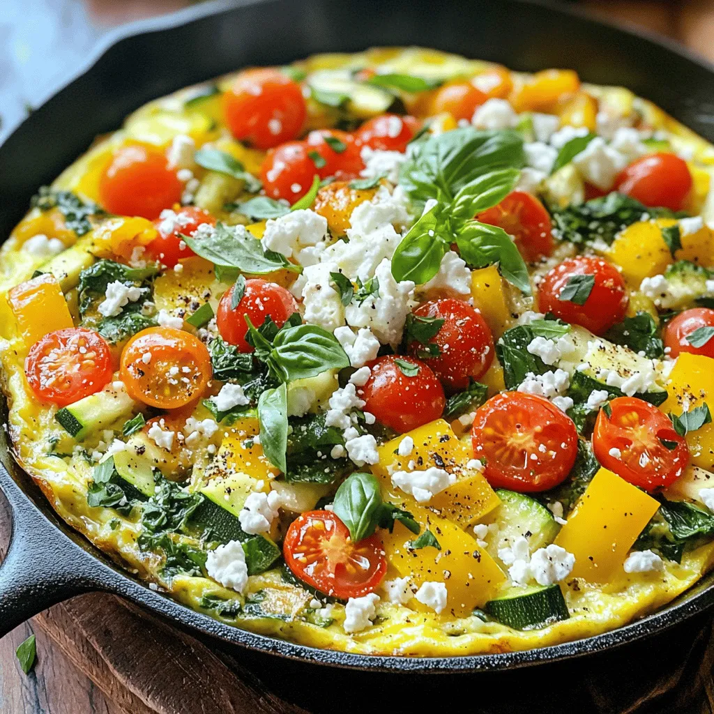 Once the veggies are ready, pour the whisked egg whites over them in the skillet. Make sure the egg whites cover all the vegetables evenly. If you want, sprinkle the feta cheese on top. Cook the frittata on the stovetop for about 2 to 3 minutes. Gently shake the pan to help set the edges. Now, it’s time to bake! Transfer the skillet to your preheated oven. Bake for about 15 to 20 minutes until the frittata is puffed and set in the center. After baking, let it cool slightly. Then, slice it into wedges and garnish with fresh herbs if you wish. Enjoy your tasty and healthy Veggie Loaded Egg White Frittata!