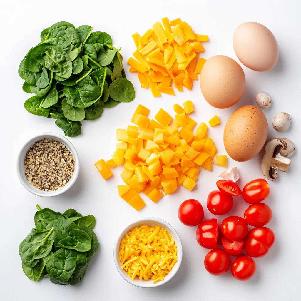 2. Mixing the egg and vegetable ingredients: In a large bowl, crack open 6 large eggs. Whisk them until they blend well. Next, add 1 cup of chopped spinach, 1/2 cup of diced bell pepper, 1/2 cup of halved cherry tomatoes, 1/2 cup of diced mushrooms, and 1/4 cup of finely chopped onion. Stir these veggies into the eggs. Then, mix in 1/4 cup of shredded cheese, 1/2 teaspoon of garlic powder, 1/2 teaspoon of dried oregano, and some salt and pepper for taste. Make sure everything is mixed evenly.